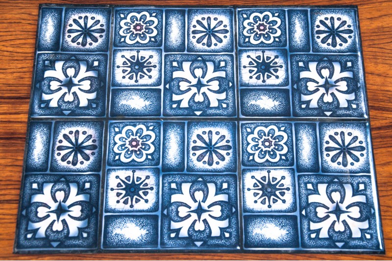 Beistelltisch mit blauer Keramik, Dänemark, 1960er Jahre. Nach der Renovierung.