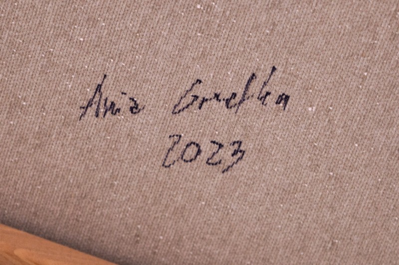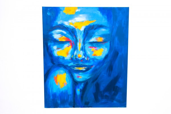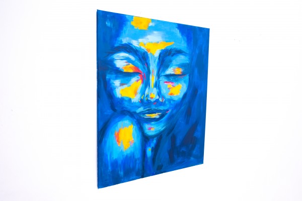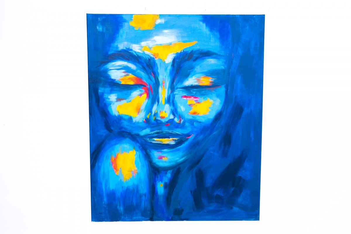 Ein Porträt, inspiriert von einer Meereswellenkarte, wo die Energie des Wassers auf die unter der Haut verborgene Energie des Feuers trifft. Die geschlossenen Augen des Porträtierten versetzen ihn in einen Zustand der Meditation, Stille und Konzentration, während kontrastierende, warme Farben wie Wellen auf der Meeresoberfläche pulsieren. Dieses Gemälde erforscht die Spannung zwischen Ruhe und Dynamik, die inneren und äußeren Wellen, die sowohl die natürliche Landschaft als auch die menschliche Emotionalität prägen.